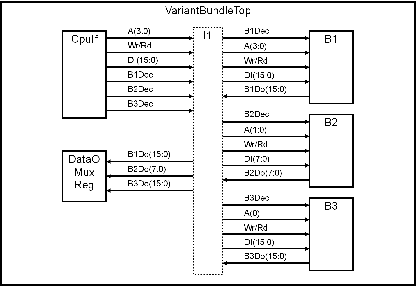 A simple model for connectivity using bundles is shown below. SimpleBundleTop is the top level of the design.